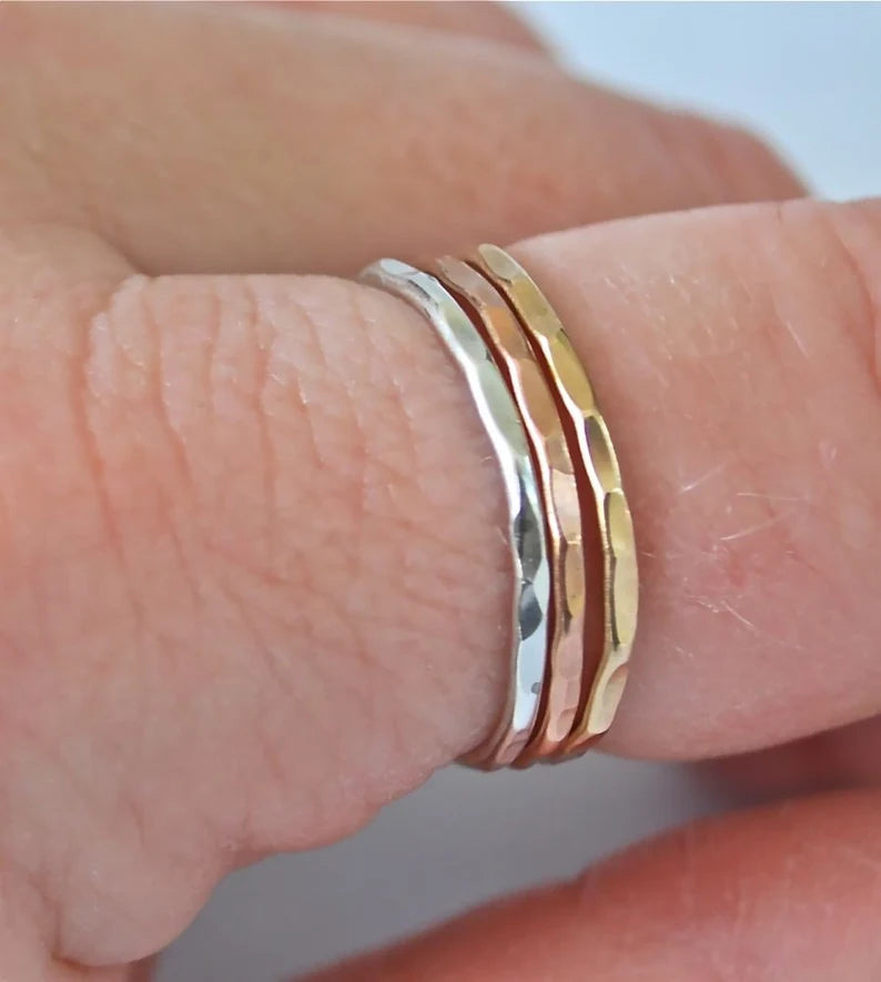 Three handmade bands are hammer faceted leaving a sparkly finish. I use recycled argentum silver, which is 93% silver and is tarnish resistant! I use only 14 kt gold filled and 14kt rose gold filled material for my rings as well as 14kt gold and rose gold solders to give you a high quality, affordable product with years and years of use!