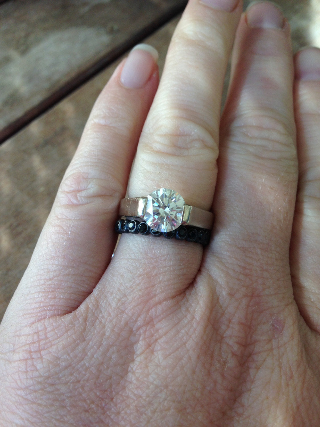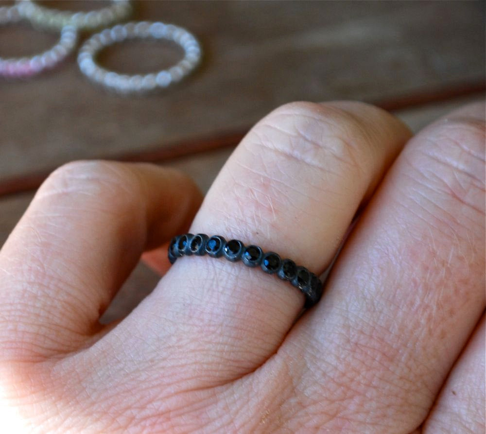 2mm black spinel all the way around with oxidized recycled sterling silver really makes the spinel pop and sparkle! You can order it shiny as well, just let me know! Stack them up to 5 if you wish but add an additional 1/2 size to your ring size if you stack 3 or more, as these rings are 2.75mm in width. These are flush set in a handmade ring. It will not catch or snag on anything.